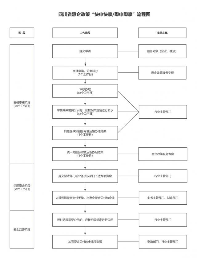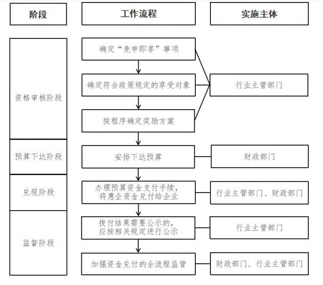 (四)制定政策兑现流程,优化申兑服务。按照“免申即享”“快申快享”两种兑现方式,编制申兑指南,以兑现条件定量化、指标化、标准化为目标,精简申报流程、环节、材料和时限,建立惠企政策从主管部门直达企业绿色通道。