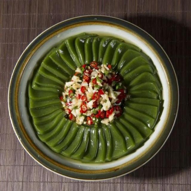 颜色碧绿,粗纤维的纹路清楚可见,闻闻还有植物的清香,主要成份是树叶,当它形成固体时切成块状,拌上香油、酱油、味精、醋、葱花,豆腐色如翡翠,红辣椒和白蒜泥点缀其间,在草木清香的烘托下,色香味俱全,诱人食欲。