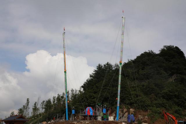 火箭蹦极的装置是以动力来拉动连接在载人环球的四条钢索,使载着人的环球在极短的时间里到达至高点。整个装置有两条高耸入云的钢桩作为主架, 两条钢桩成倒八字形固定在地面。为了保证桩的稳定性,每条桩 还有三条钢缆成三角形状拉住。当火箭发射时,连接环球的钢缆 在机械的拉动下往回缩,把人送到高处后,钢缆又住回放,整 个环球又以自由落体的速度往下降,还没到地面又向上升,整个过程就这样反复进行,直到结速为止,时间大约有2分钟。尖叫与刺激,值得去体验。