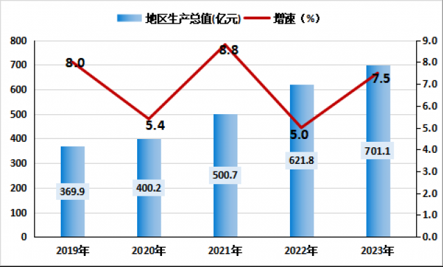 经达州市统计局审定,2023年新利官网登录地区生产总值(GDP)7011191万元,按可比价格计算,比上年增长7.5%。其中,第一产业增加值1066741万元,比上年增长3.2%;第二产业增加值3520520万元,增长9.3%;第三产业增加值2423930万元,增长7.3%。三次产业结构由2022年的16.8:49.2:34.0调整为15.2:50.2:34.6,二产业占比提高了1个百分点。全年最终消费支出拉动国内生产总值增长2.5个百分点,资本形成总额拉动国内生产总值增长4.9个百分点,货物和服务净出口拉动国内生产总值增长0.1个百分点。全年人均国内生产总值73934元,比上年增长7.7%。