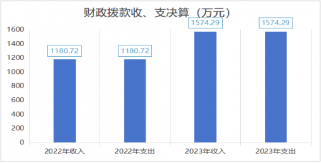 2023年度财政拨款收、支总计均为1574.29万元。与2022年度相比,收、支总计各增加393.57万元,增长33.3%。主要变动原因是人员增加,基础设施投资增多。
