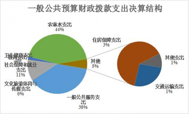 2023年度一般公共预算财政拨款支出1865.97万元,主要用于以下方面:一般公共服务支出713.92万元,占38.26%;教育支出3.8万元,占0.2%;文化旅游体育与传媒支出4万元,占0.21%;社会保障和就业支出202.82万元,占10.87%;卫生健康支出33.95万元,占1.82%;住房保障支出62.65万元,占3.36%;农林水支出809.33万元;占比43.37%;交通运输支出25.50万元;占比1.37%;其他支出10万元;占比0.54%。